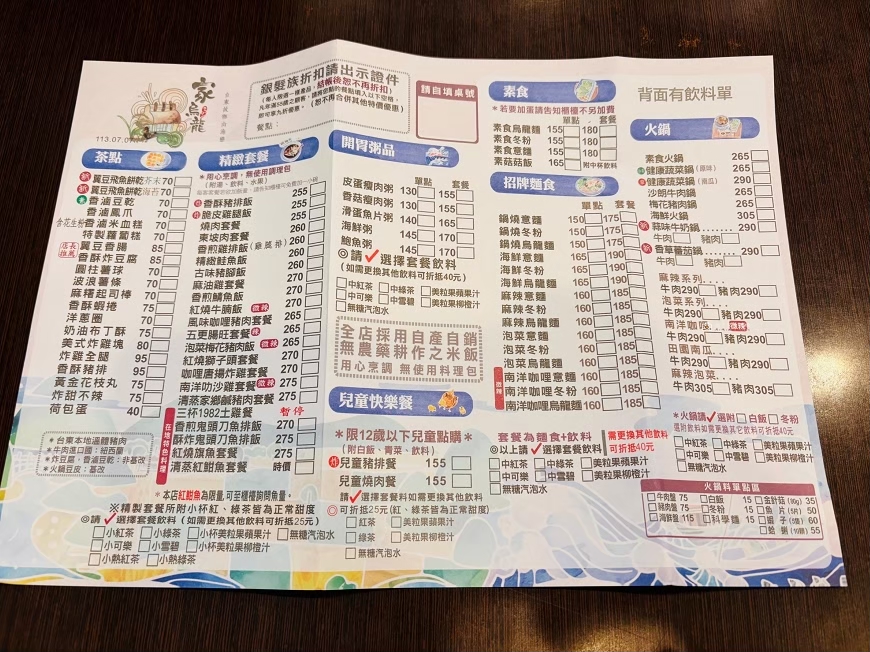 烏龍院家庭食堂的餐點有小點心、套餐、兒童餐、火鍋、麵食及飲料,拿著菜單到櫃檯點餐結帳,就可以等餐點啦!